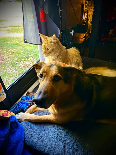 So why the sudden shift? In between forest walks and fireside breakfasts, our furry friend and fellow pizza connoisseur, Achilles had a sudden health scare. After 11 years of perfect health, he started having seizures. Following a late-night ER visit, we learned he has a brain tumor. The good news? He’s responding well to meds, regaining his energy, and still loves frolicking around the forest on our long walks. We’ve been savoring the slower pace, including more snuggles and play.